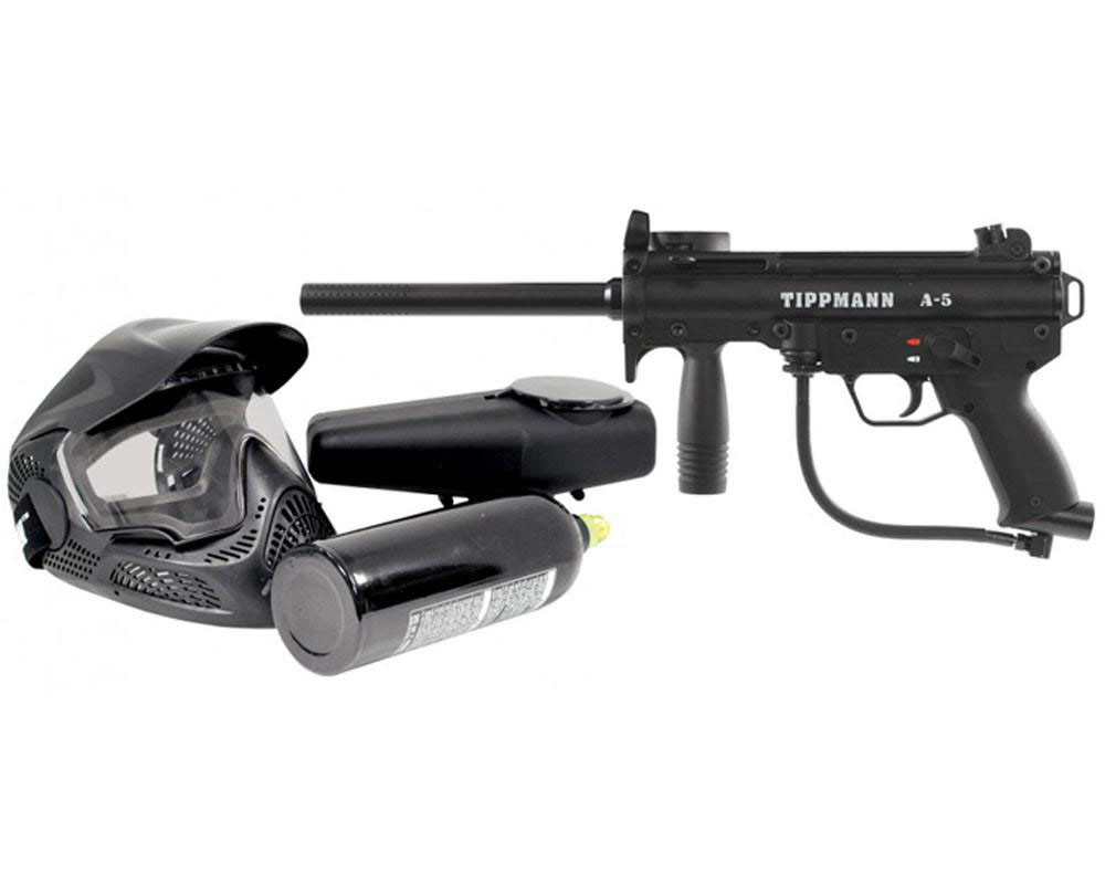 The Tippmann A-5 is the most popular scenario marker ever produced. The A-5 features a durable aluminum body, inline bolt system, front and rear sling mounts, low profile hopper and 8.5” high performance ported barrel. It is easy to upgrade to the three position E-grip selector switch kit, Response Trigger or the Flatline barrel. The A-5 is known for its ability to be customized with many aftermarket accessories and features Tippmann’s World Class 2-year Warranty. Power Pack includes a 20-ounce CO2 tank and high-performance goggle with anti-fog lens Cyclone Feed System can fire 15 balls per second without batteries The A-5 can be field stripped in less than 60 seconds without tools Two position external selector switch allows players to easily change from safe to firing mode Enhanced ergonomics with a longer front grip, lighter weight body and easierto remove push pins