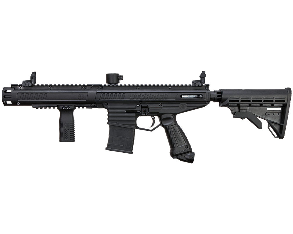The new Tippmann Stormer is a completely modular .68 caliber marker for all levels of play. The Stormer Series is available in 3 models allowing full customization. The Stormer Basic features our reliable in-line bolt system with a high-impact composite body. The Stormer Tactical adds Tactical Front Shroud, Front / Rear Flip Up Sights and a 6 Position Collapsible Stock that completes the military look. The Stormer Elite allows you to switch between loader and mag fed configurations offering several different looks to switch between. Dual Feed modular design that can be convert to be hopper or magazine fed and different looks High-impact composite body Internal gas line Multiple Picatinny Rails Vertical Grip Proven, in-line bolt design High-Performance Barrel Bottom mounted asa Single Trigger Offset Feedport Includes Tactical Front Shroud, Front and Rear Flip Up Sights, 6 Position Collapsible Stock, Dummy Magazine, 2 Paintball Magazines and Loader to Magazine conversion parts