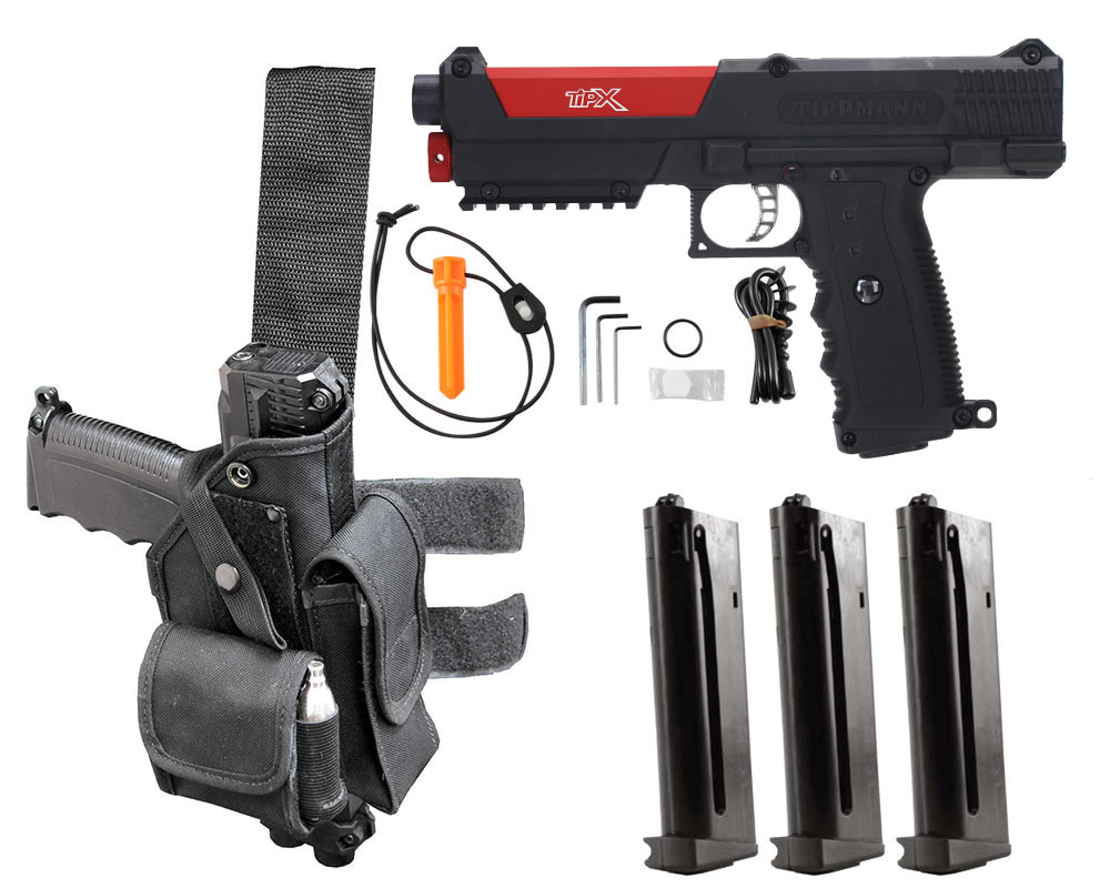 Paintball Pistols The Deluxe Pistol Kit includes a TiPX Pistol, Reversible Holster, Maintenance Kit and 3 Tru-Feed Magazines. The new TiPX™ .68 Caliber Paintball Pistol is an exciting new compact design that will be dependable, lightweight, easy to maintain and affordable. The new Tippmann TiPX Pistol comes with 2 magazine clips, a barrel blocking device, and a maintenance kit. The Tippmann Pistol has a barrel that is easy to remove. The Tippmann Pistol uses a standard Tippmann A5 or Tippmann X