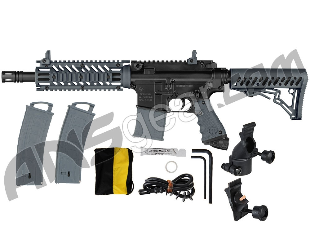Introducing the latest MagFed Extremely Authentic AR-Styled Tactical Carbine Marker! Go MagFed or traditional loader and get the best of both worlds in one awesome package. The TMC can be fully accessorized giving the player more unique options for Tactical Games, combining functionality with the World renowned Tippmann reliability for the next standard in MagFed products. Full Pneumatic Marker Proven High Performing In-Line Bolt System Dual Feed Option: Can Be Hopper Or Magazine Fed Extremely Authentic AR Look And Feel Fully Functional Charging Handle Easy-Pull Trigger Over Molded Rubber Grip 12" High Performance Barrel With Muzzle Break Bottom Mounted ASA Internal Stainless Steel Gas Line 2 Position External Selector 5 Position Collapsible Stock Durable Aluminum Receiver Front And Rear Adjustable Sights Integrated Sling Mounts AR-15 Style Shroud With Built-In 4 Sided Picatinny Rails