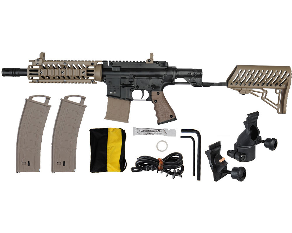This TMC has an adjustable Air-Thru Stock that can hold a 13ci 3000psi tank. Tank sold separately A Full Pneumatic Marker Proven High Performing In-Line Bolt System Dual Feed Option: Can Be Hopper Or Magazine Fed Extremely Authentic AR Look And Feel Fully Functional Charging Handle Easy-Pull Trigger Over Molded Rubber Grip 12" High-Performance Barrel With Muzzle Break Bottom Mounted ASA Internal Stainless Steel Gas Line 2 Position External Selector 5 Position Collapsible Stock Durable Aluminum Receiver Front And Rear Adjustable Sights Integrated Sling Mounts AR-15 Style Shroud With Built-In 4 Sided Picatinny Rails