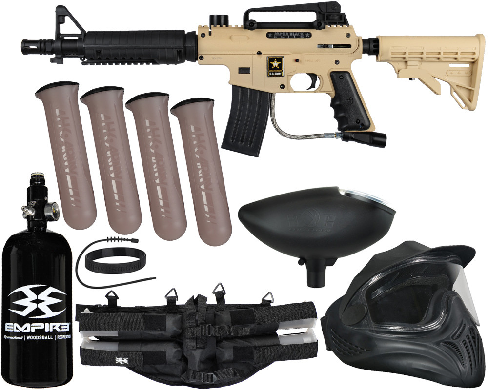 Patterned after the formidable M4 Small Arms Rifle, the new US Army Alpha Black paintball gun offers authentic looking realism right out of the box. Manufactured by Tippmann Sports, Alpha Black boasts an in-line bolt system, all-aluminum die cast receiver, stainless steel gas line and quick release feeder elbow.