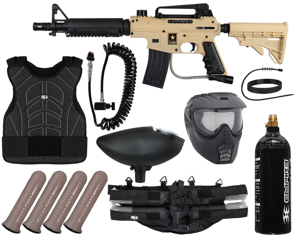 Patterned after the formidable M4 Small Arms Rifle, the new US Army Alpha Black paintball gun offers authentic looking realism right out of the box. Manufactured by Tippmann Sports, Alpha Black boasts an in-line bolt system, all-aluminum die cast receiver, stainless steel gas line and quick release feeder elbow.