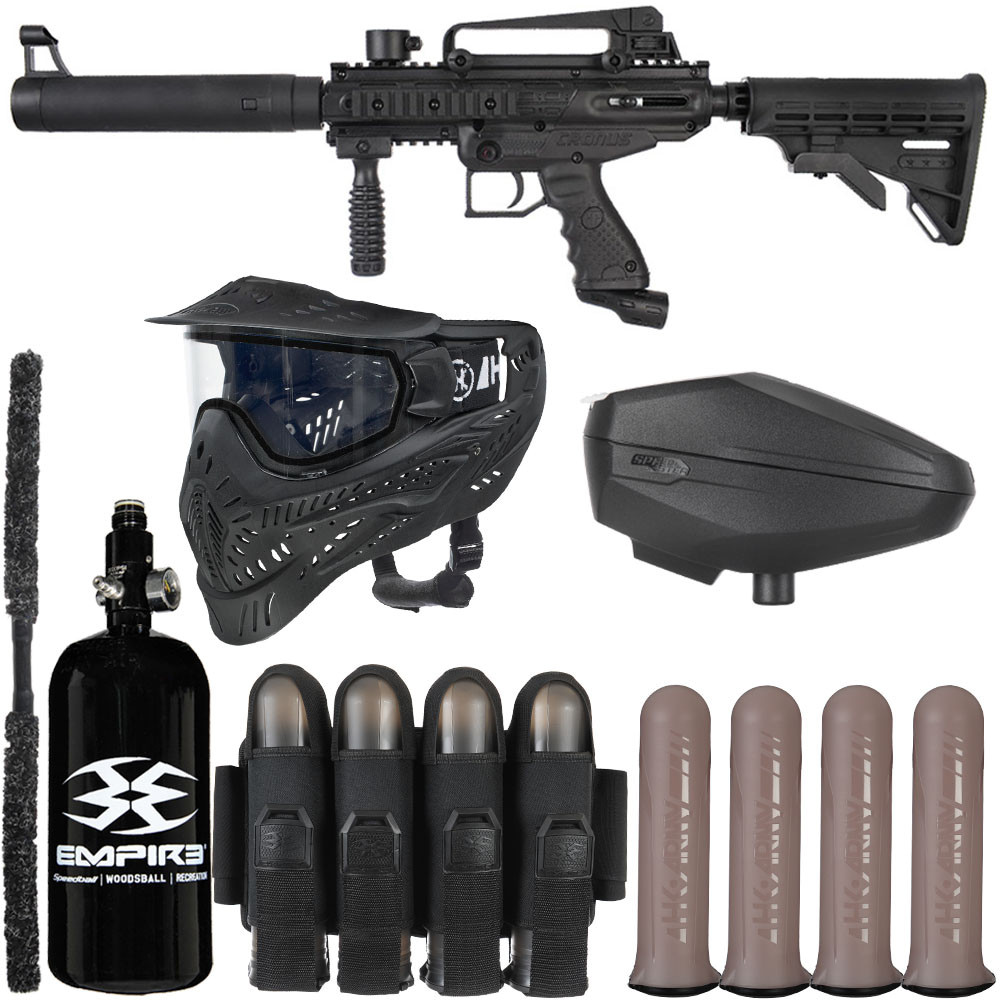 The all-new Tippmann Cronus Tactical Edition combines performance and durability in an attention-grabbing milsim body. The marker’s high-impact, composite construction is extremely lightweight and features molded-rubber grips and an internal gas line for enhanced comfort, control, and maneuverability. The Cronus also offers four Picatinny rails for fast and easy modification and utilizes Tippmann’s proven in-line bolt system. The tactical edition adds a mock silencer with sight, a carry handle, and an adjustable stock.
