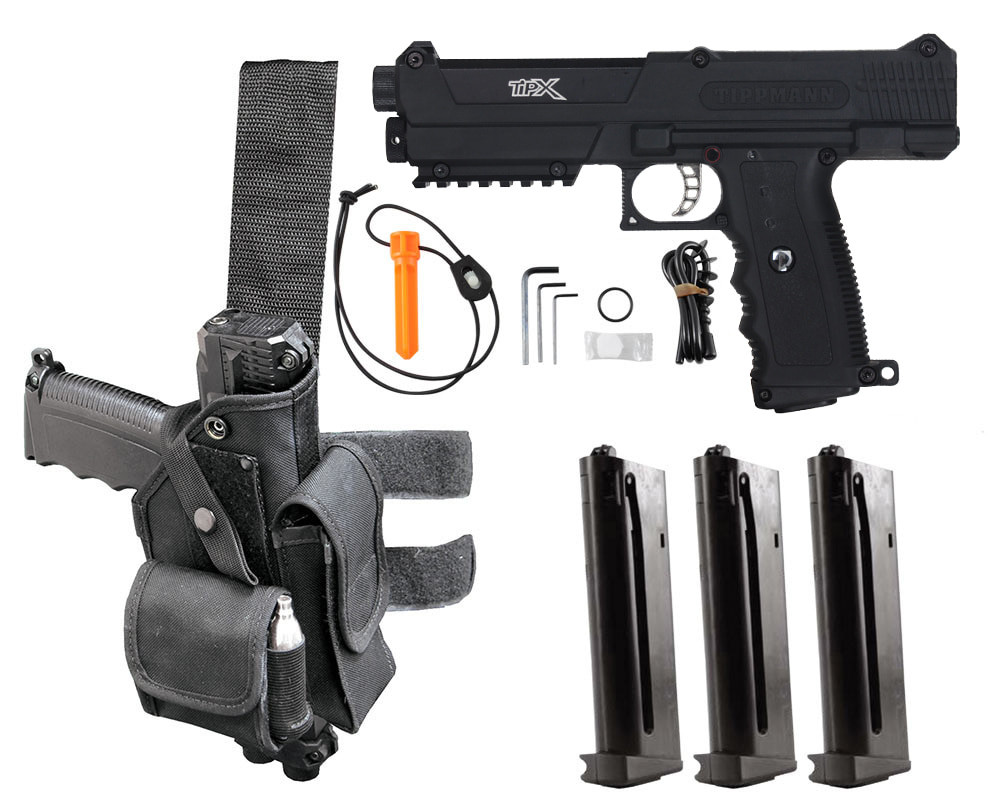 The new TiPX™ .68 Caliber Paintball Pistol is an exciting new compact design that will be dependable, lightweight, easy to maintain and affordable. The new Tippmann TiPX Pistol comes with 2 magazine clips, a barrel blocking device, and a maintenance kit. The Tippmann Pistol has a barrel that is easy to remove. The Tippmann Pistol uses a standard Tippmann A5 or Tippmann X
