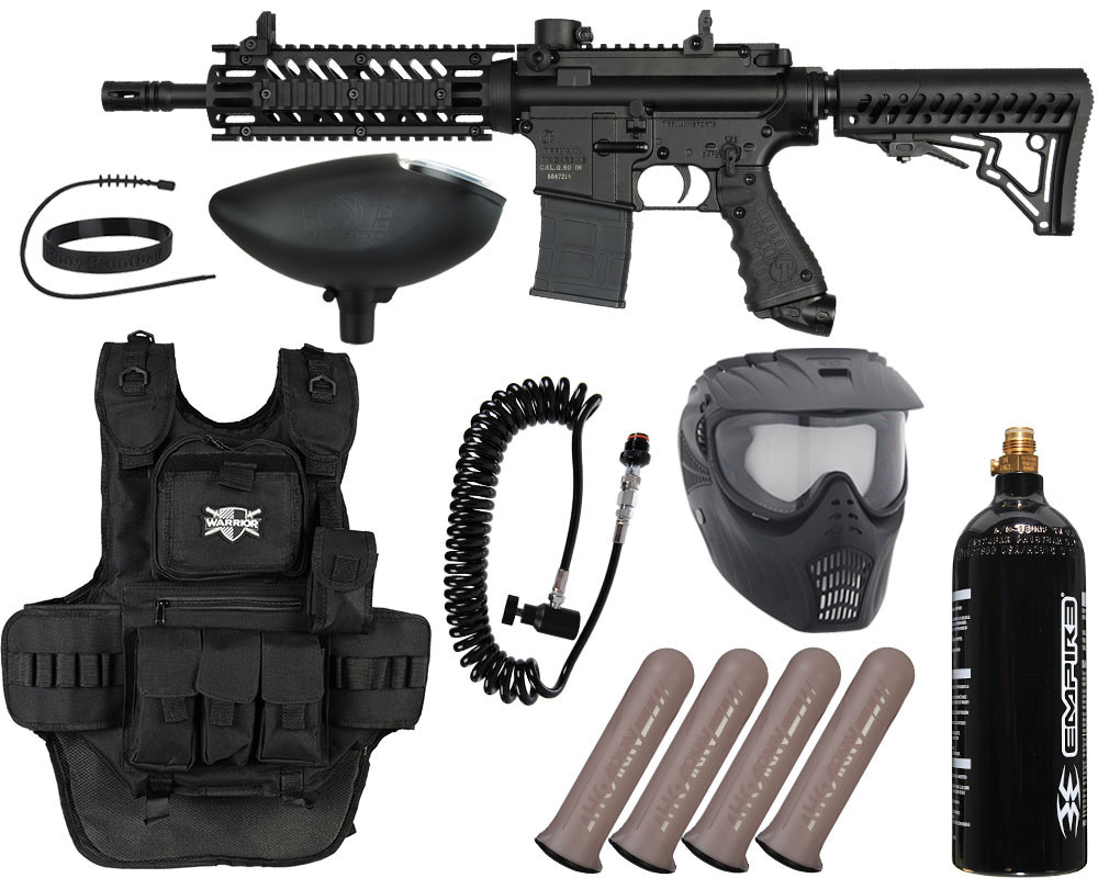 The TMC is designed to be an authentic AR-styled tactical carbine. One feature that makes the TMC stand out from the rest is that the user has the choice of using either a hopper or a magazine to load paint into their gun. A fully functional charging handle adds to the realism as well as a carbine stock and quad rail barrel shroud. A 12” barrel comes standard and can be upgraded to any Tippmann 98 threaded barrel. Gas lines are internal to provide a clean appearance. Fully functional front and rear sights are great for target acquisition. The TMC is a semi-automatic gun that includes a push button safety and requires no batteries. CO2 or Compressed Air can be used as an air source.