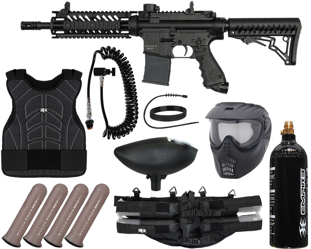 The TMC is designed to be an authentic AR-styled tactical carbine. One feature that makes the TMC stand out from the rest is that the user has the choice of using either a hopper or a magazine to load paint into their gun. A fully functional charging handle adds to the realism as well as a carbine stock and quad rail barrel shroud. A 12” barrel comes standard and can be upgraded to any Tippmann 98 threaded barrel. Gas lines are internal to provide a clean appearance. Fully functional front and rear sights are great for target acquisition. The TMC is a semi-automatic gun that includes a push button safety and requires no batteries. CO2 or Compressed Air can be used as an air source.