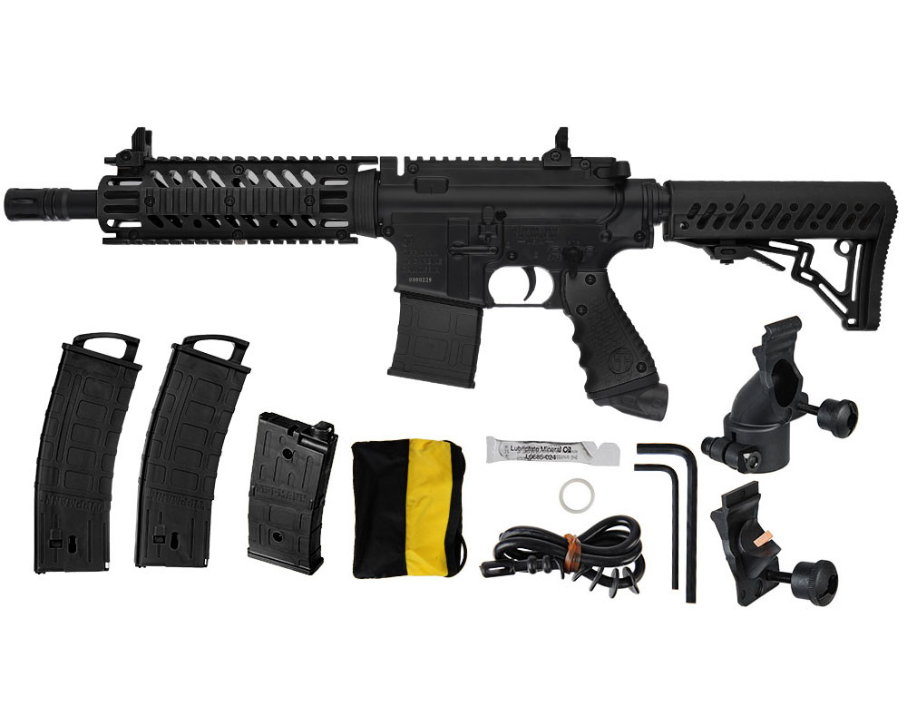 Full Pneumatic Marker Proven High Performing In-Line Bolt System Dual Feed Option: Can Be Hopper Or Magazine Fed Extremely Authentic AR Look And Feel Fully Functional Charging Handle Easy-Pull Trigger Over Molded Rubber Grip 12" High Performance Barrel With Muzzle Break Bottom Mounted ASA Internal Stainless Steel Gas Line 2 Position External Selector 5 Position Collapsible Stock Durable Aluminum Receiver Front And Rear Adjustable Sights Integrated Sling Mounts AR-15 Style Shroud With Built-In 4 Sided Picatinny Rails