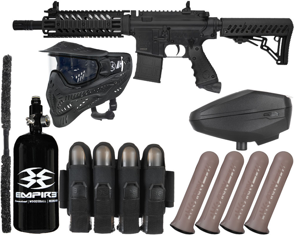 The TMC is designed to be an authentic AR-styled tactical carbine. One feature that makes the TMC stand out from the rest is that the user has the choice of using either a hopper or a magazine to load paint into their gun. A fully functional charging handle adds to the realism as well as a carbine stock and quad rail barrel shroud. A 12” barrel comes standard and can be upgraded to any Tippmann 98 threaded barrel. Gas lines are internal to provide a clean appearance. Fully functional front and rear sights are great for target acquisition. The TMC is a semi-automatic gun that includes a push button safety and requires no batteries. CO2 or Compressed Air can be used as an air source.